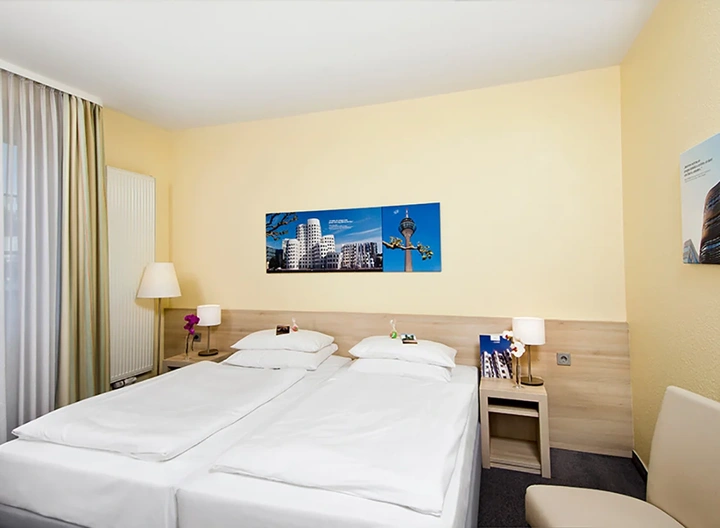 Je verblijft in een moderne tweepersoonskamer op het hoogste 3-sterrenniveau met 24-uursroomservice.