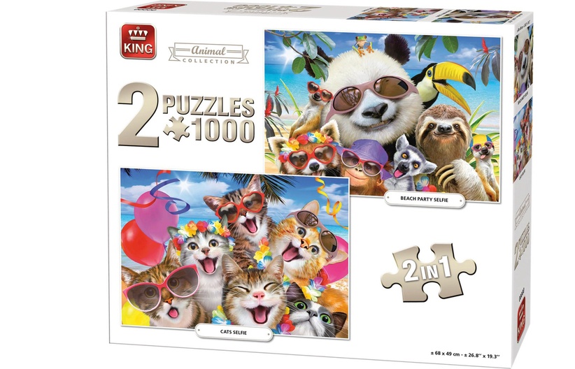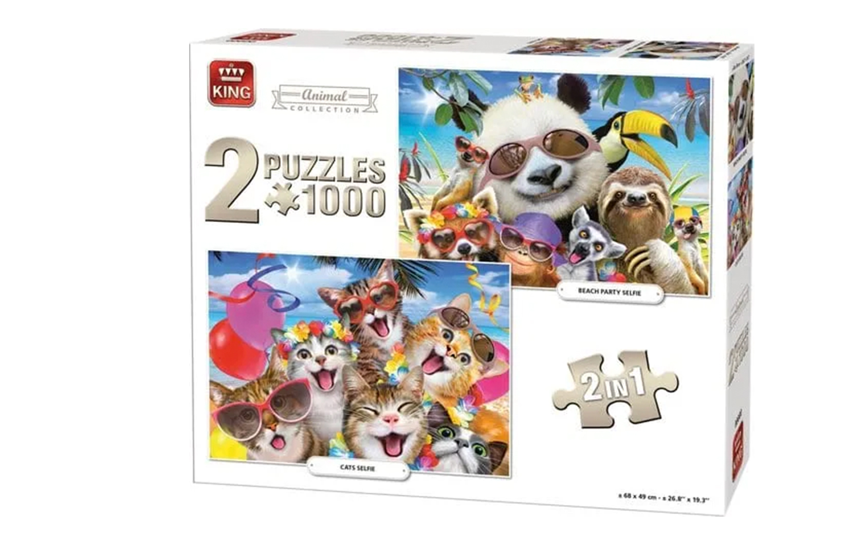 Kleurrijke en vrolijke King legpuzzel ‘Animal Selfies Collection’ – een set van 2 uitdagende puzzels met in totaal 1000 stukjes, vol speelse en humoristische dierenselfies.